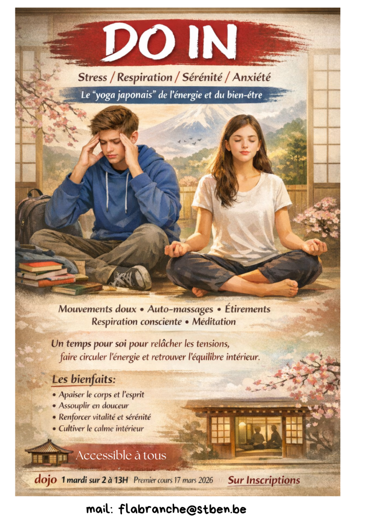 Dans le cadre de ma fonction d’enseignante au secondaire inférieur, j’ai la joie de proposer deux mardis par mois des ateliers de Do In aux élèves.